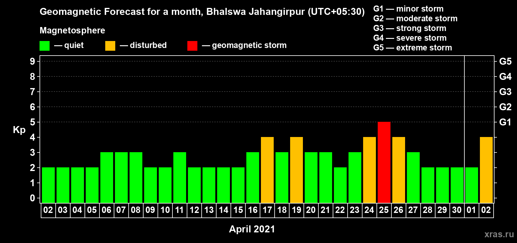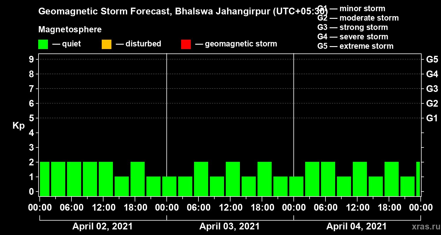 Geomagnetic storm forecast in Bhalswa Jahangirpur for Apr 02, 2021