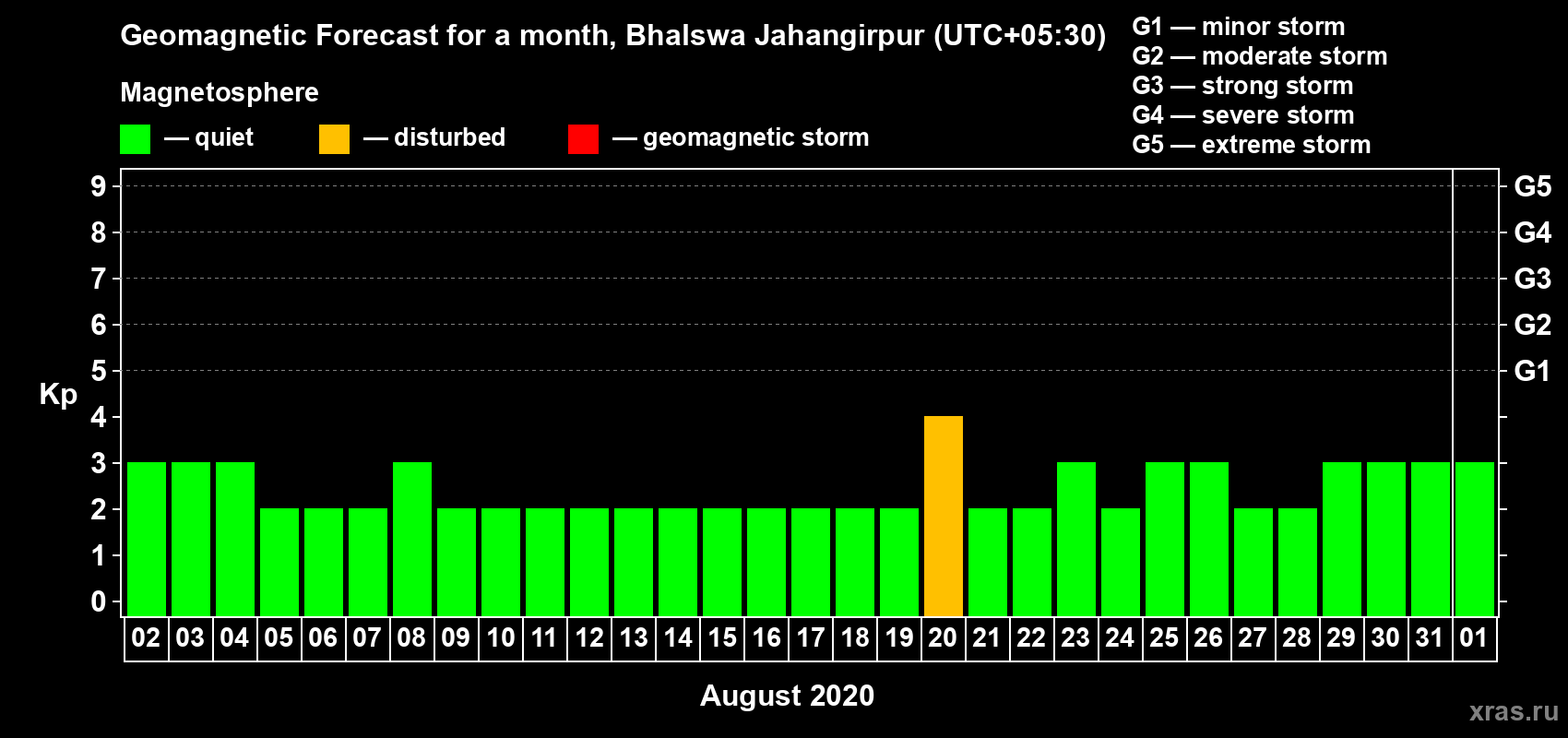 Geomagnetic storm forecast in Bhalswa Jahangirpur for Aug 02, 2020