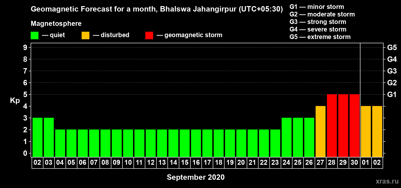 Geomagnetic storm forecast in Bhalswa Jahangirpur for Sep 02, 2020
