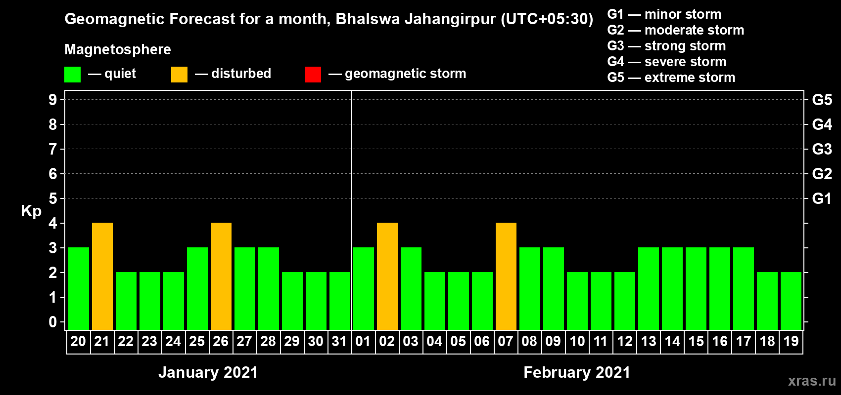 Geomagnetic storm forecast in Bhalswa Jahangirpur for Jan 20, 2021