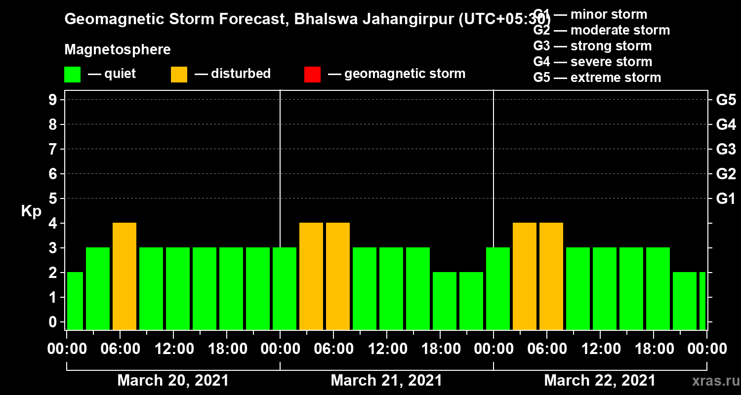 Geomagnetic storm forecast in Bhalswa Jahangirpur for Mar 20, 2021
