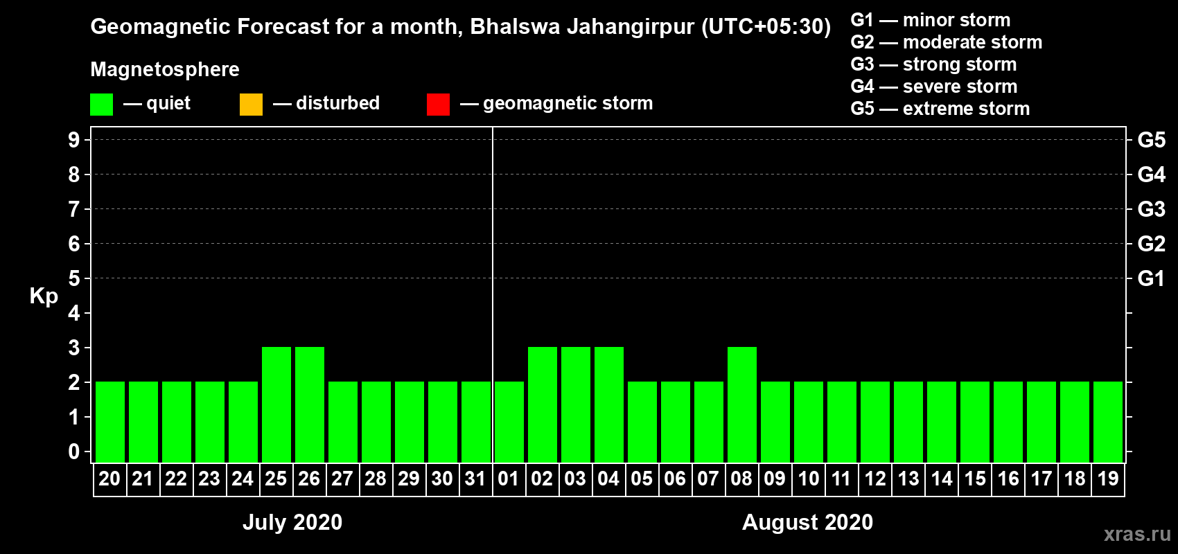 Geomagnetic storm forecast in Bhalswa Jahangirpur for Jul 20, 2020