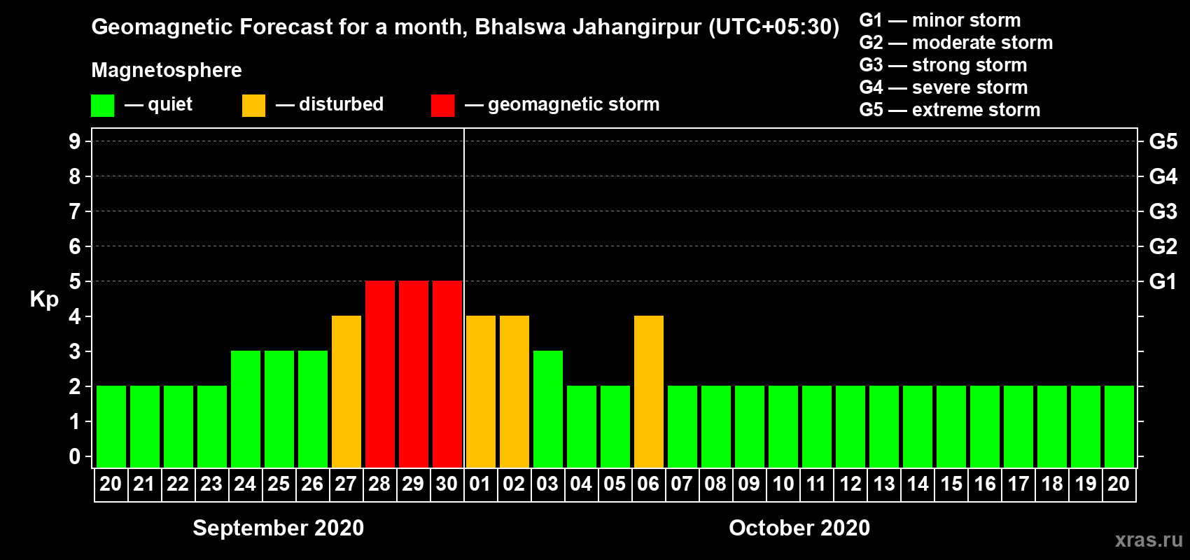 Geomagnetic storm forecast in Bhalswa Jahangirpur for Sep 20, 2020