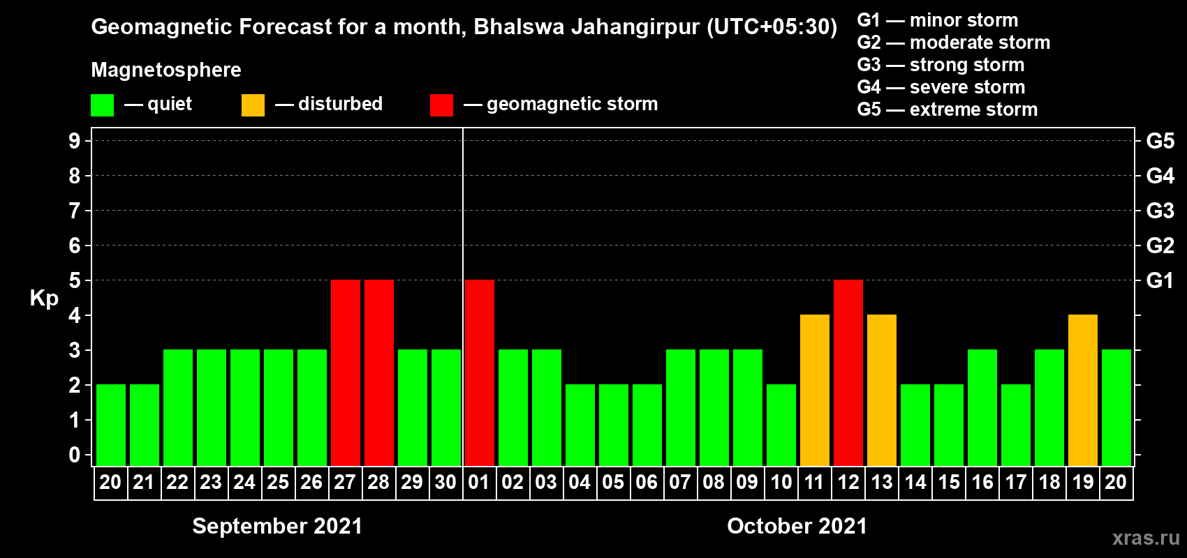 Geomagnetic storm forecast in Bhalswa Jahangirpur for Sep 20, 2021