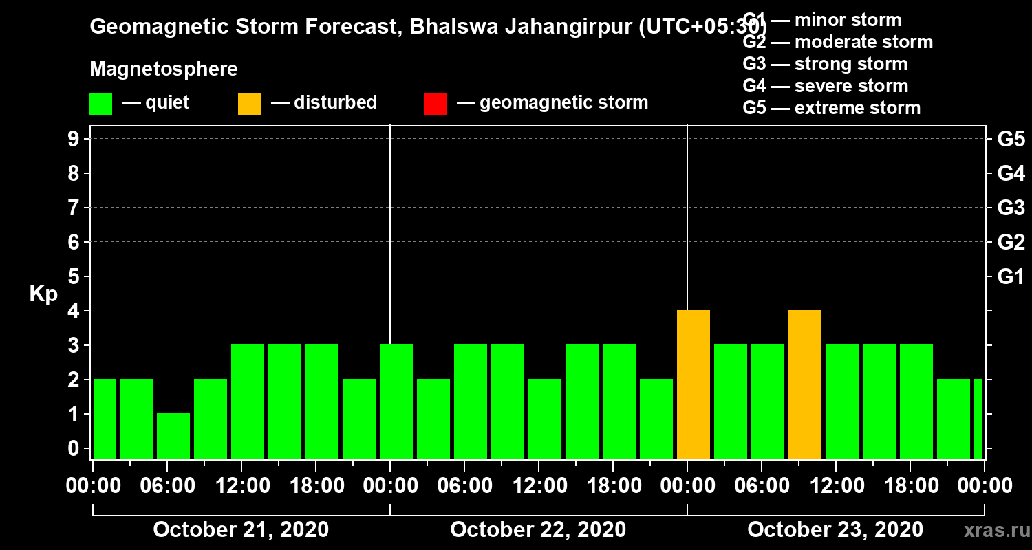 Geomagnetic storm forecast in Bhalswa Jahangirpur for Oct 21, 2020