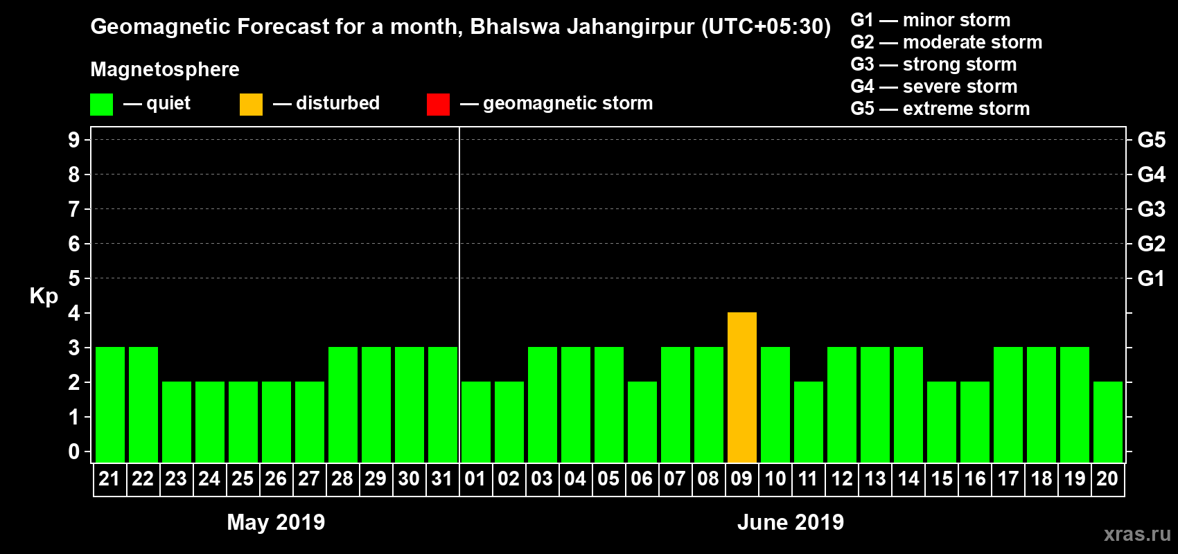 Geomagnetic storm forecast in Bhalswa Jahangirpur for May 21, 2019
