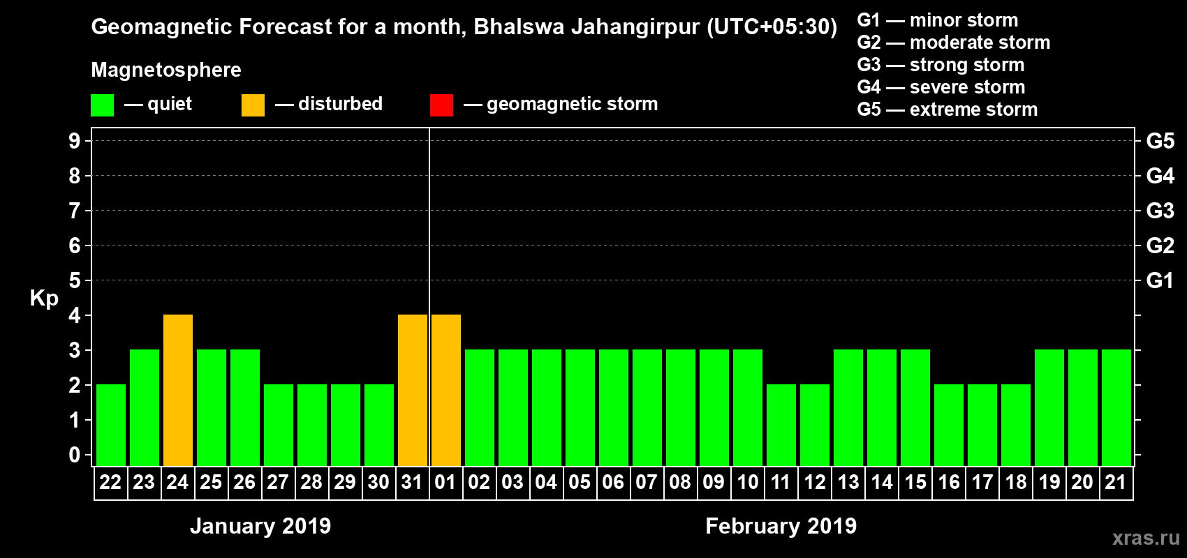 Geomagnetic storm forecast in Bhalswa Jahangirpur for Jan 22, 2019
