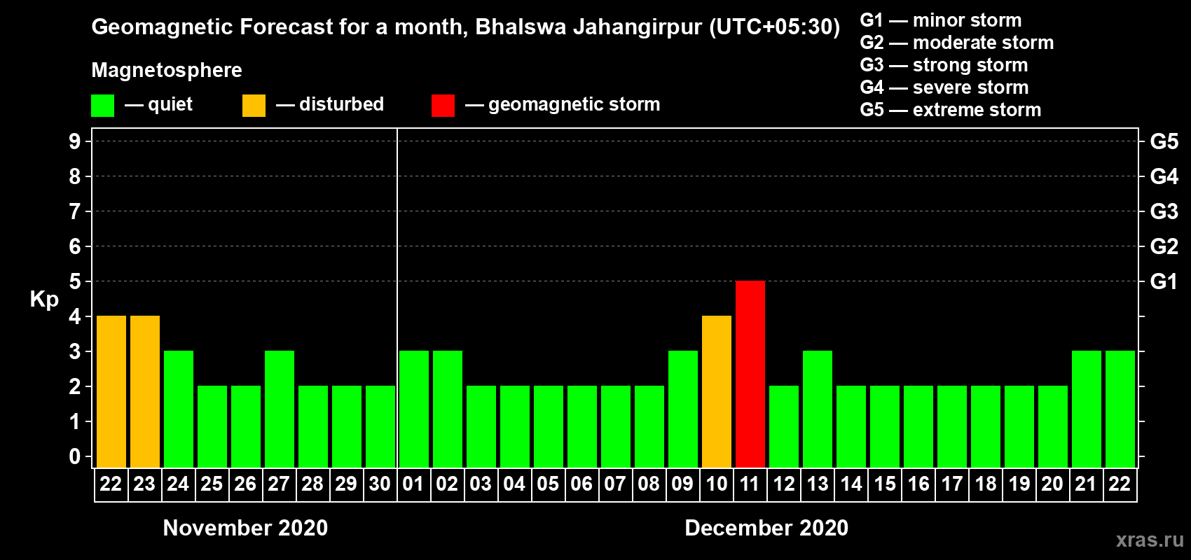 Geomagnetic storm forecast in Bhalswa Jahangirpur for Nov 22, 2020