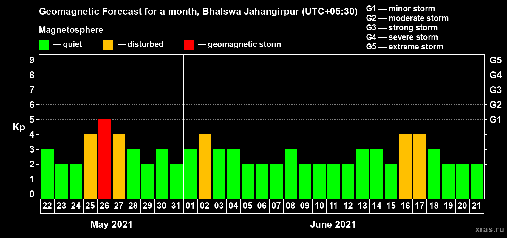 Geomagnetic storm forecast in Bhalswa Jahangirpur for May 22, 2021