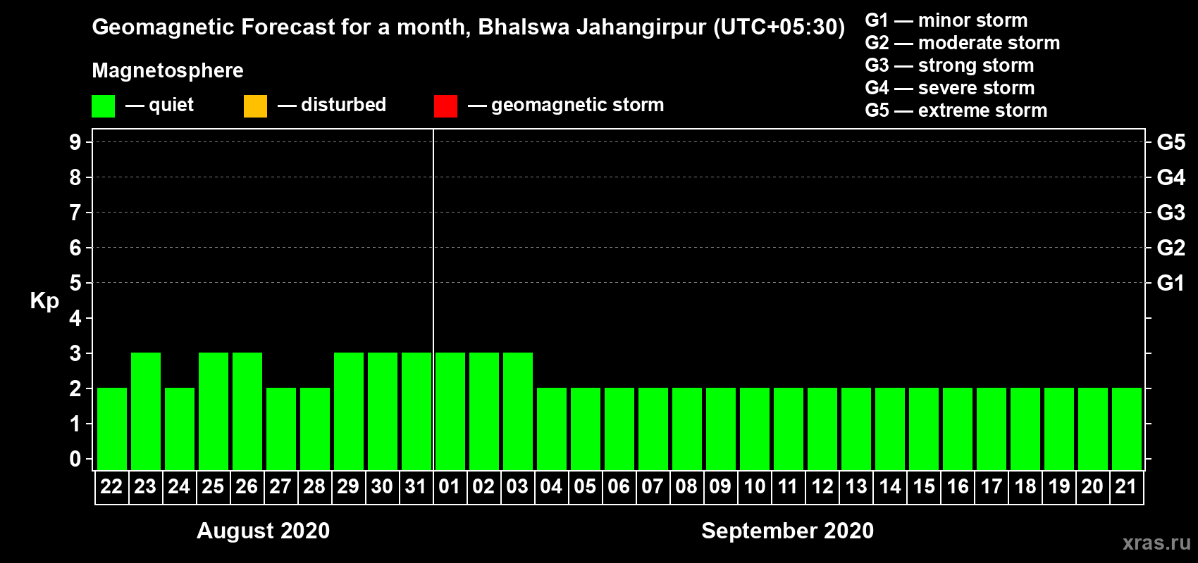 Geomagnetic activity forecast in Bhalswa Jahangirpur — Aug 22, 2020