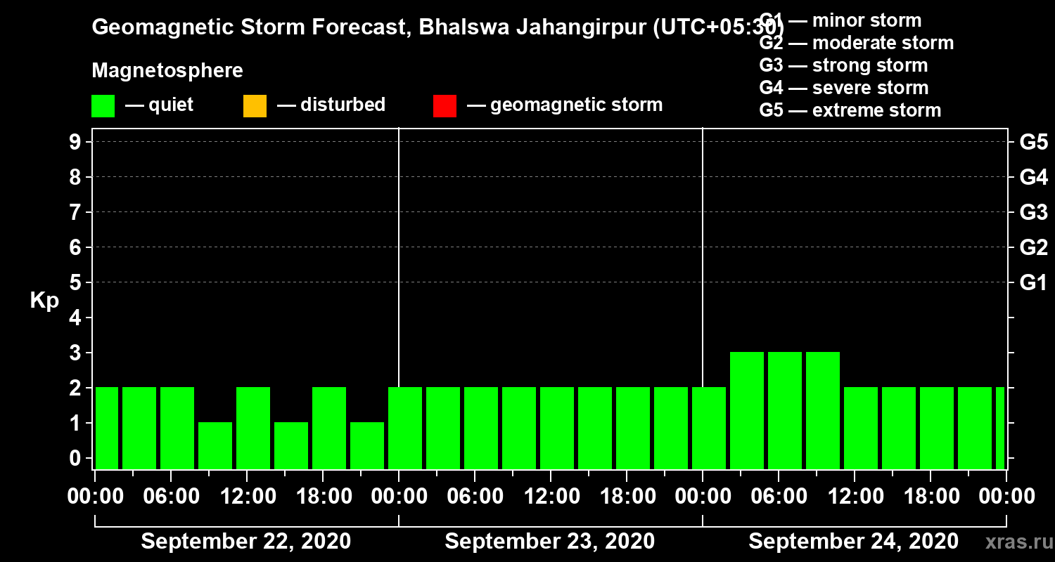 Geomagnetic storm forecast in Bhalswa Jahangirpur for Sep 22, 2020