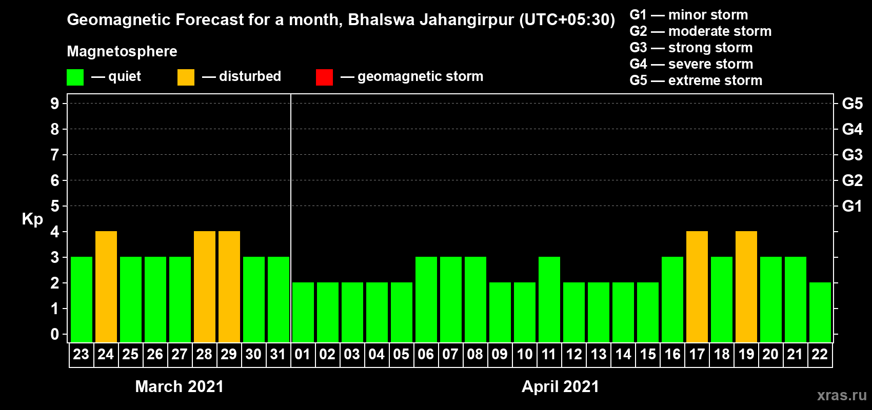 Geomagnetic activity forecast in Bhalswa Jahangirpur — Mar 23, 2021