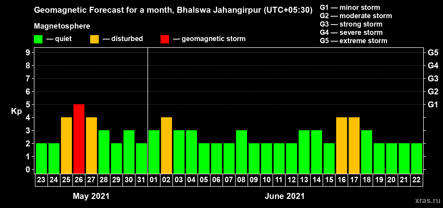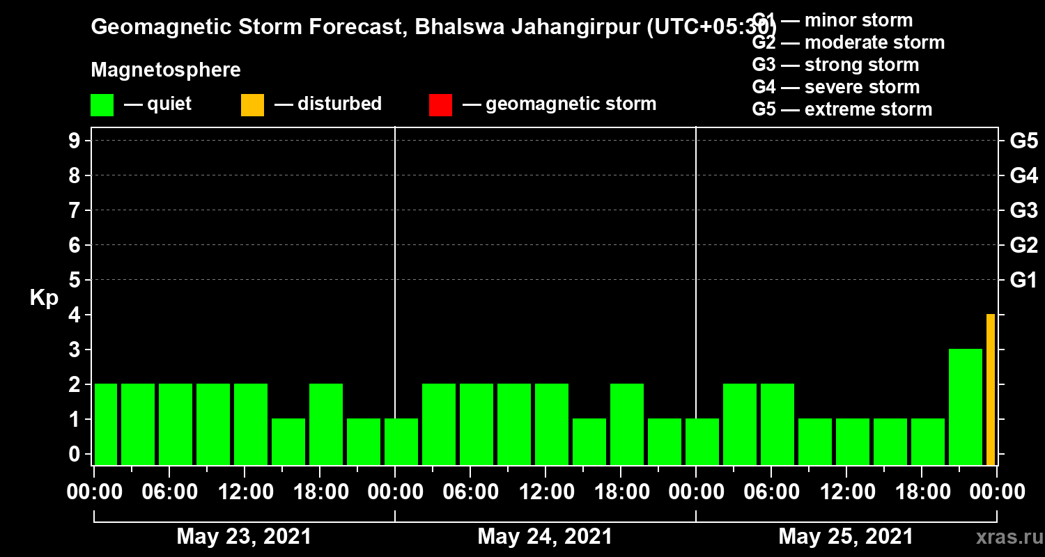 Geomagnetic storm forecast in Bhalswa Jahangirpur for May 23, 2021
