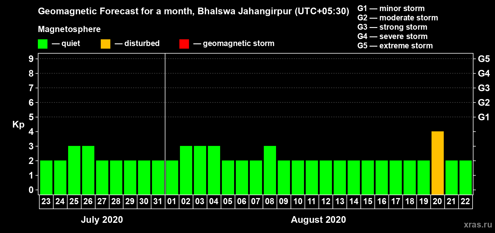 Geomagnetic activity forecast in Bhalswa Jahangirpur — Jul 23, 2020
