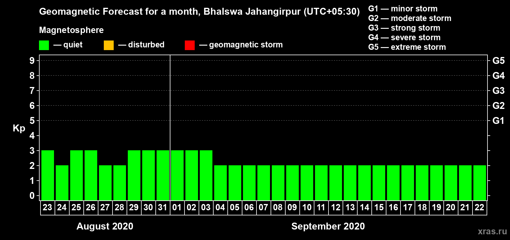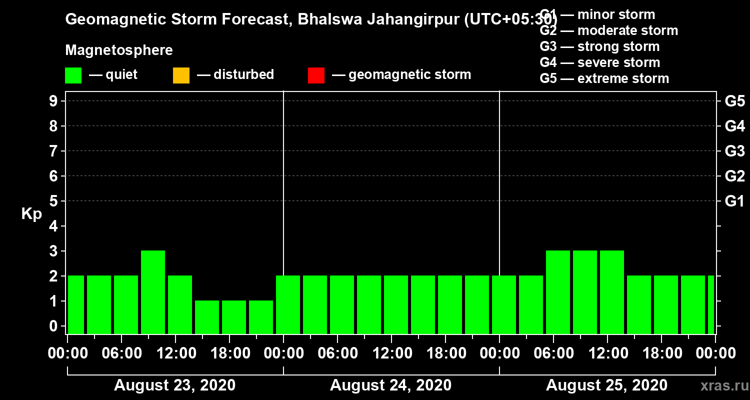 Geomagnetic activity forecast in Bhalswa Jahangirpur — Aug 23, 2020