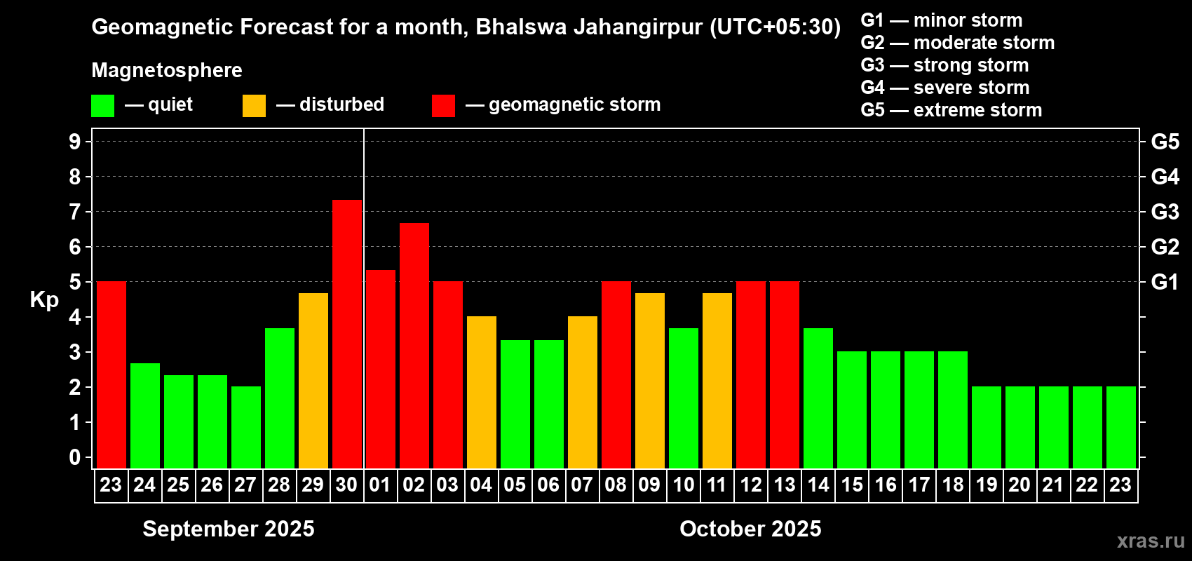 Geomagnetic storm forecast in Bhalswa Jahangirpur for Sep 23, 2025