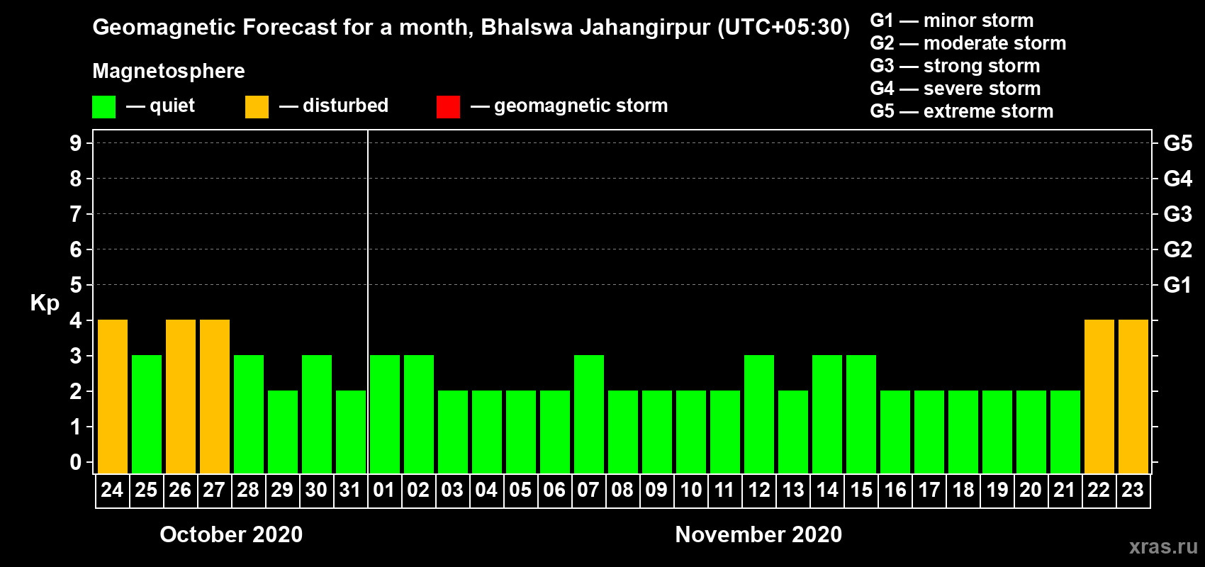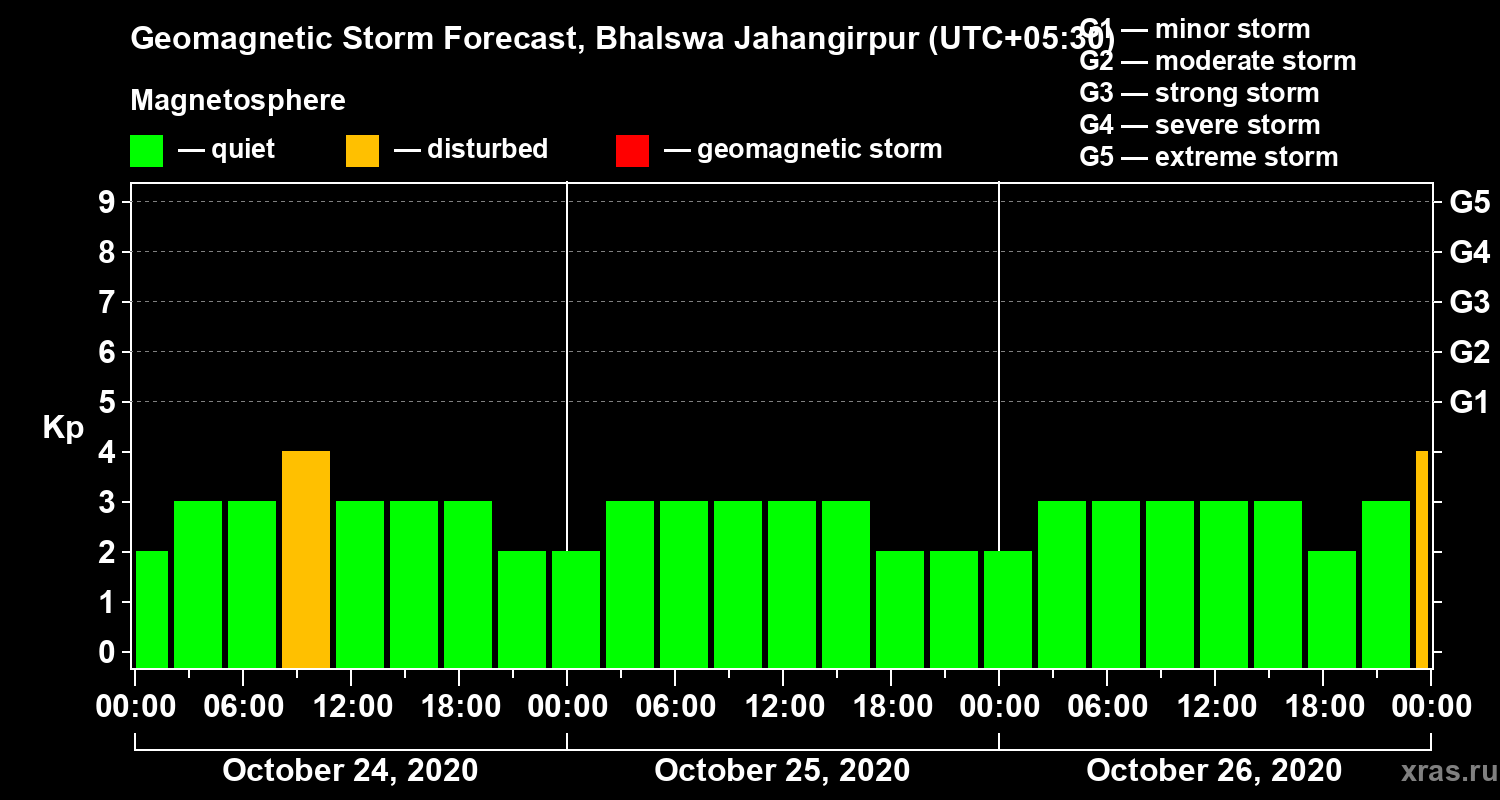 Geomagnetic storm forecast in Bhalswa Jahangirpur for Oct 24, 2020