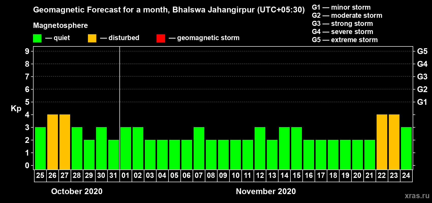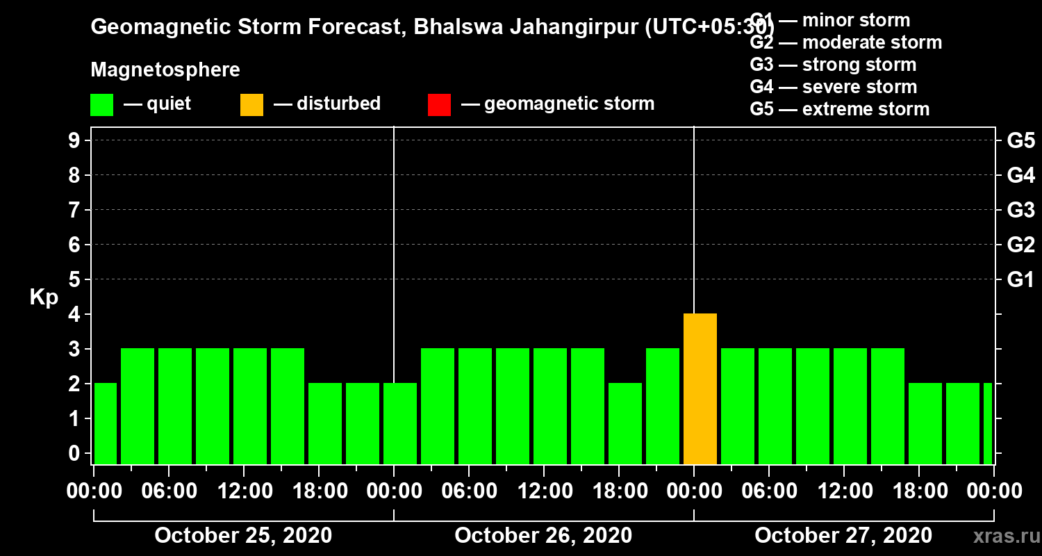Geomagnetic storm forecast in Bhalswa Jahangirpur for Oct 25, 2020