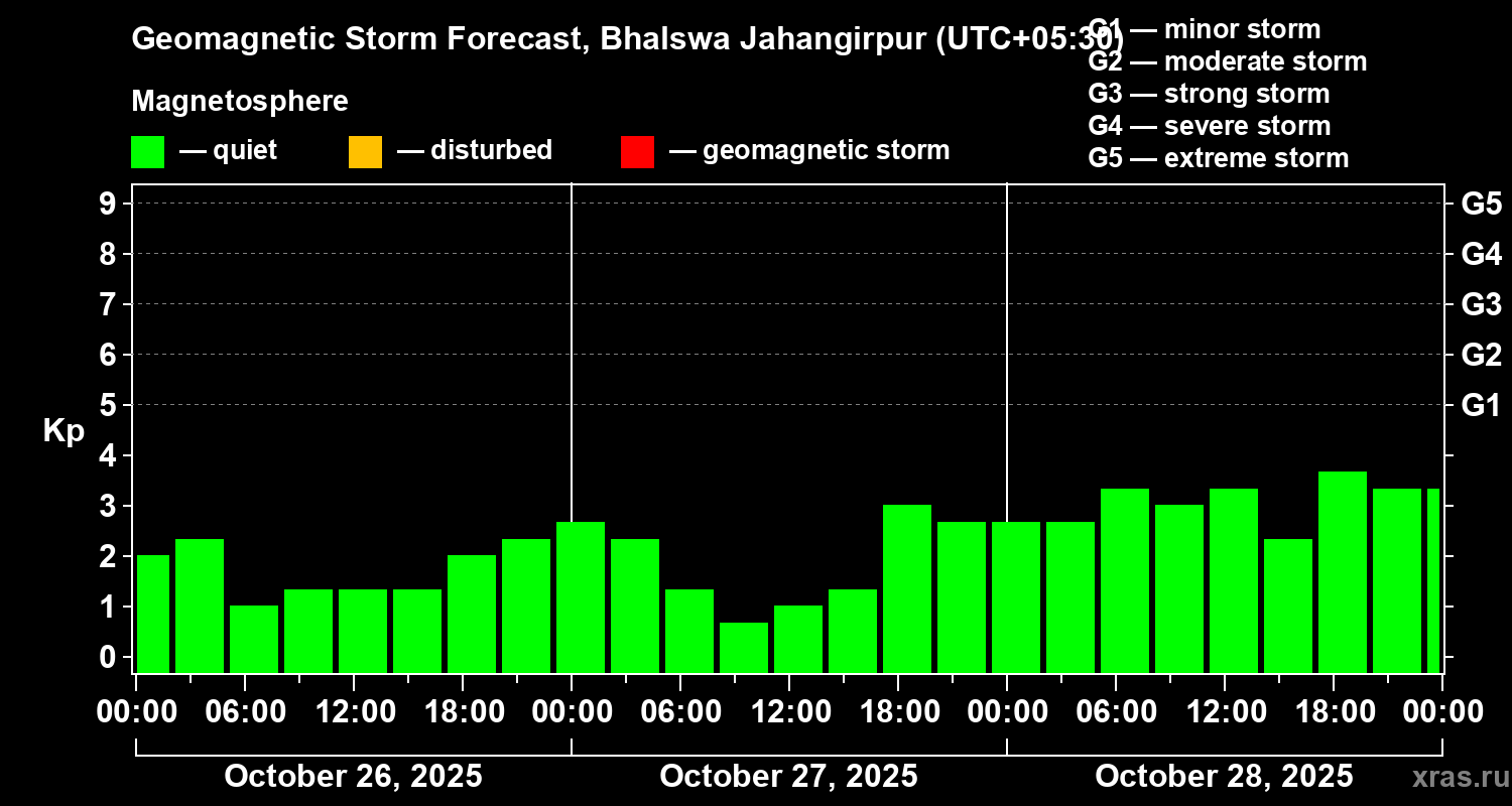 Geomagnetic storm forecast in Bhalswa Jahangirpur for Oct 26, 2025