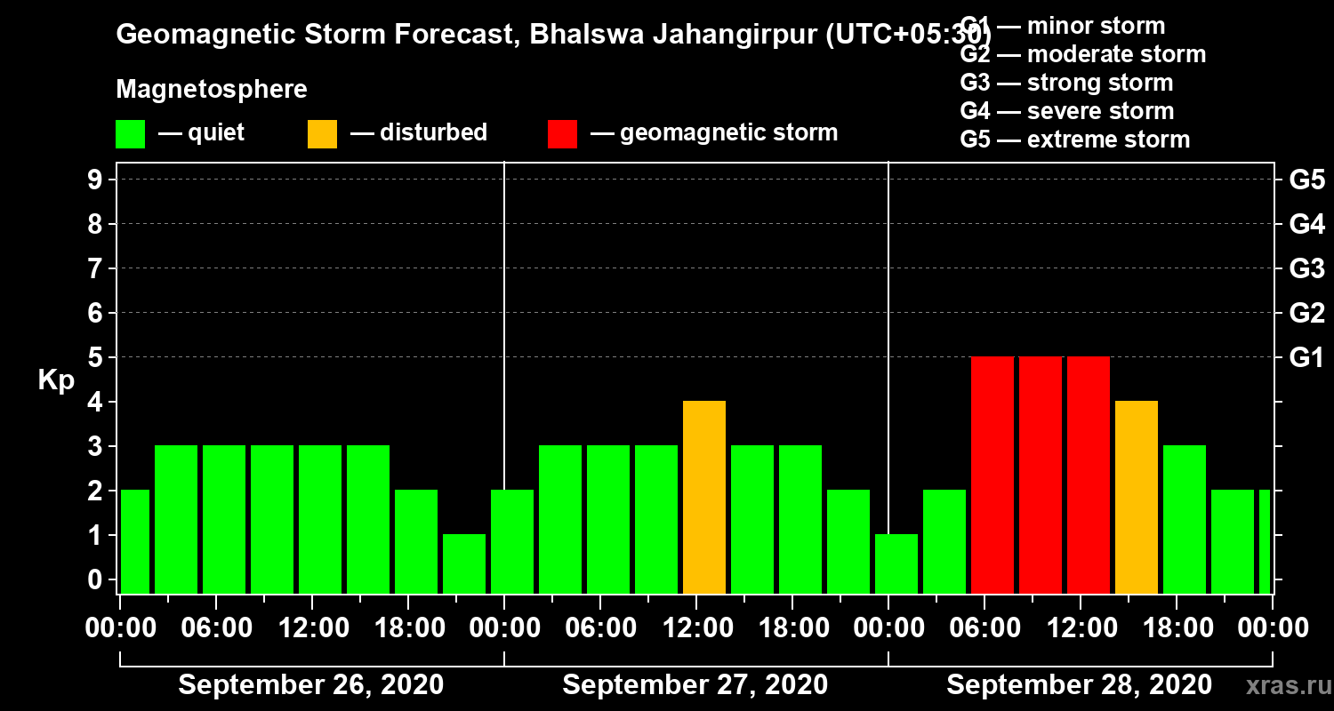 Geomagnetic storm forecast in Bhalswa Jahangirpur for Sep 26, 2020