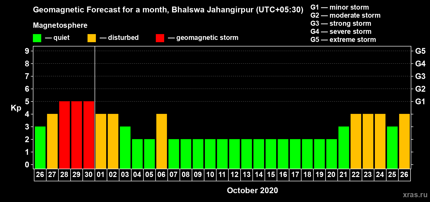 Geomagnetic activity forecast in Bhalswa Jahangirpur — Sep 26, 2020