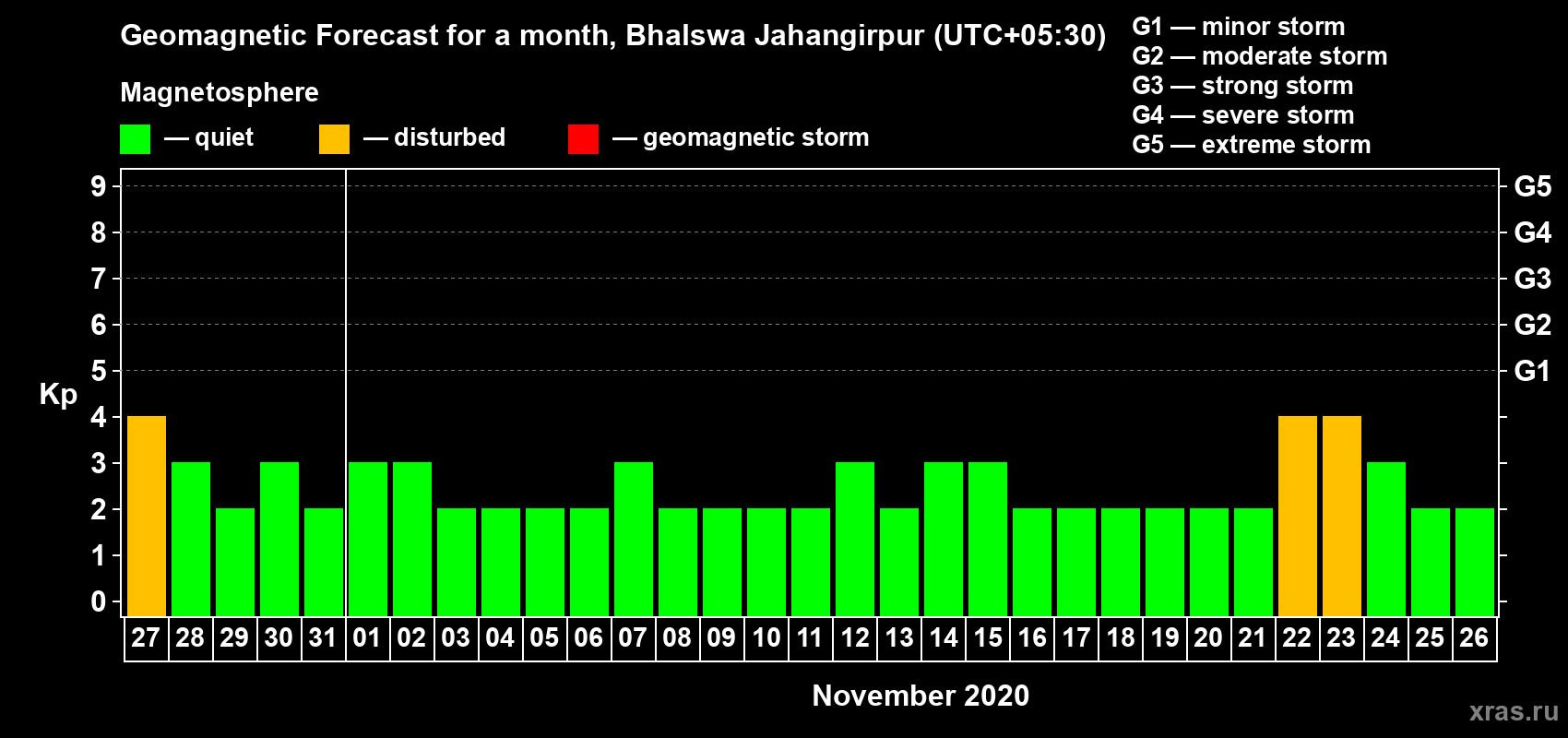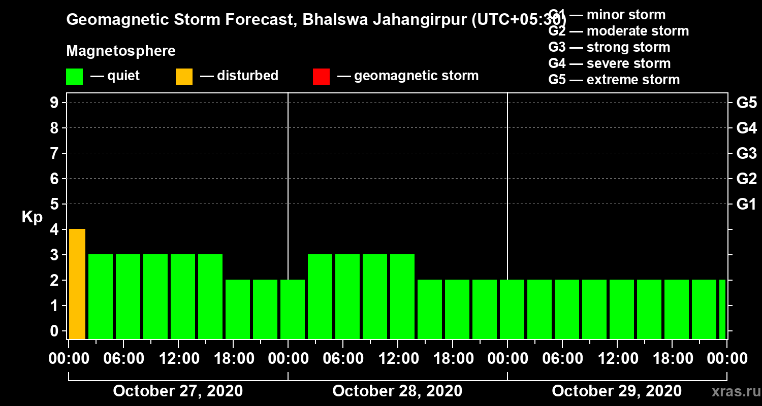 Geomagnetic storm forecast in Bhalswa Jahangirpur for Oct 27, 2020