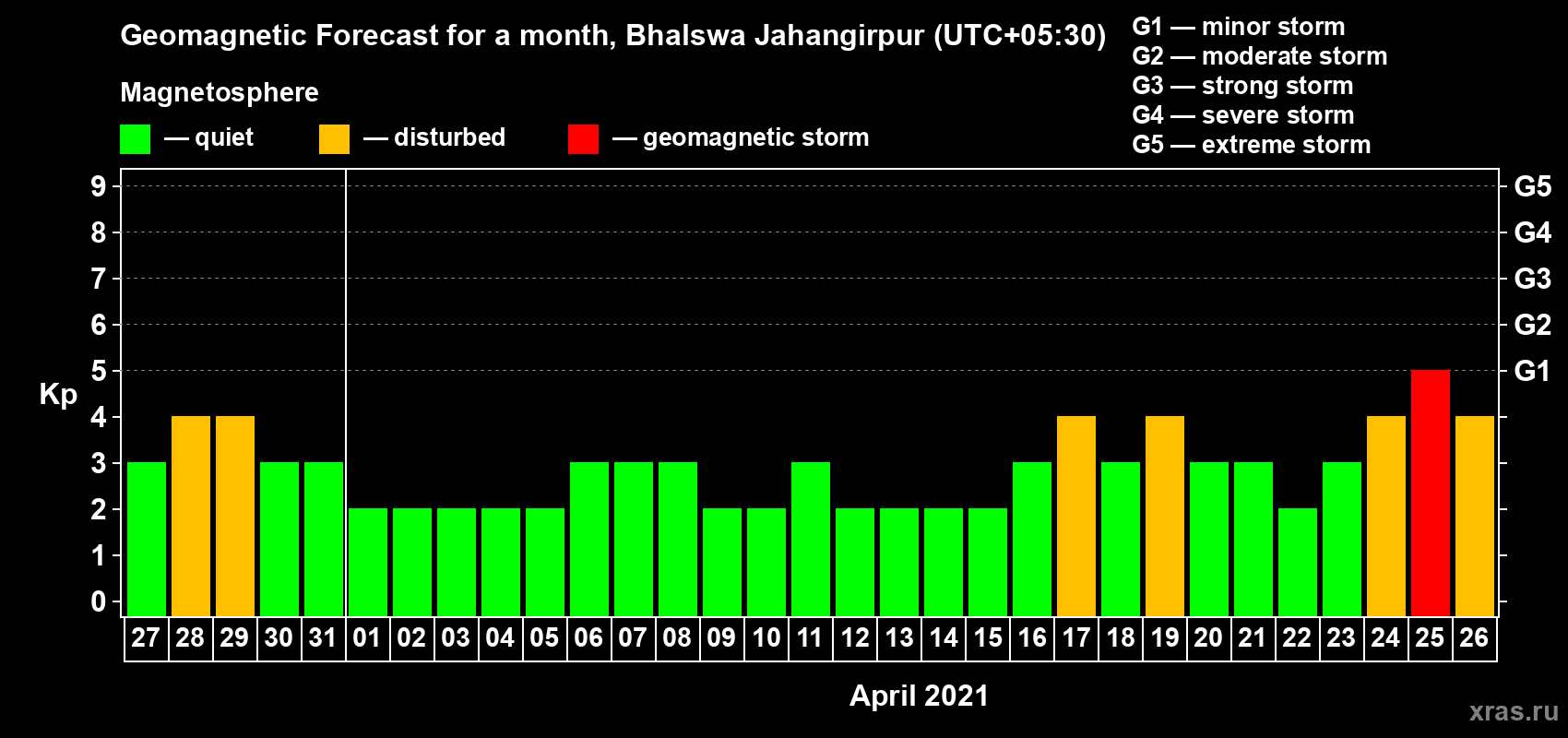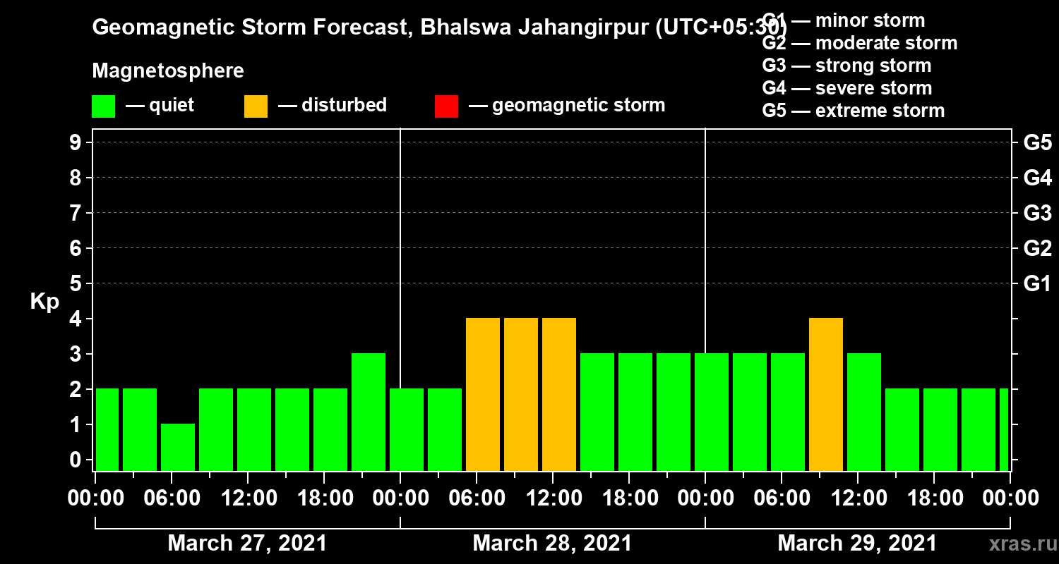 Geomagnetic storm forecast in Bhalswa Jahangirpur for Mar 27, 2021