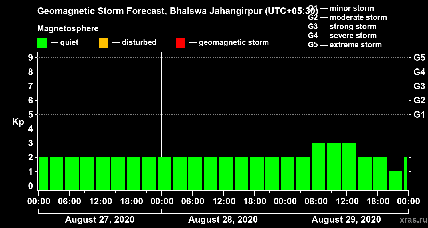 Geomagnetic storm forecast in Bhalswa Jahangirpur for Aug 27, 2020