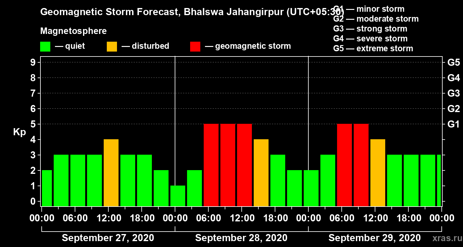 Geomagnetic storm forecast in Bhalswa Jahangirpur for Sep 27, 2020