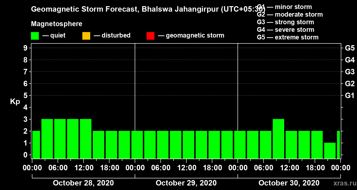 Geomagnetic storm forecast in Bhalswa Jahangirpur for Oct 28, 2020