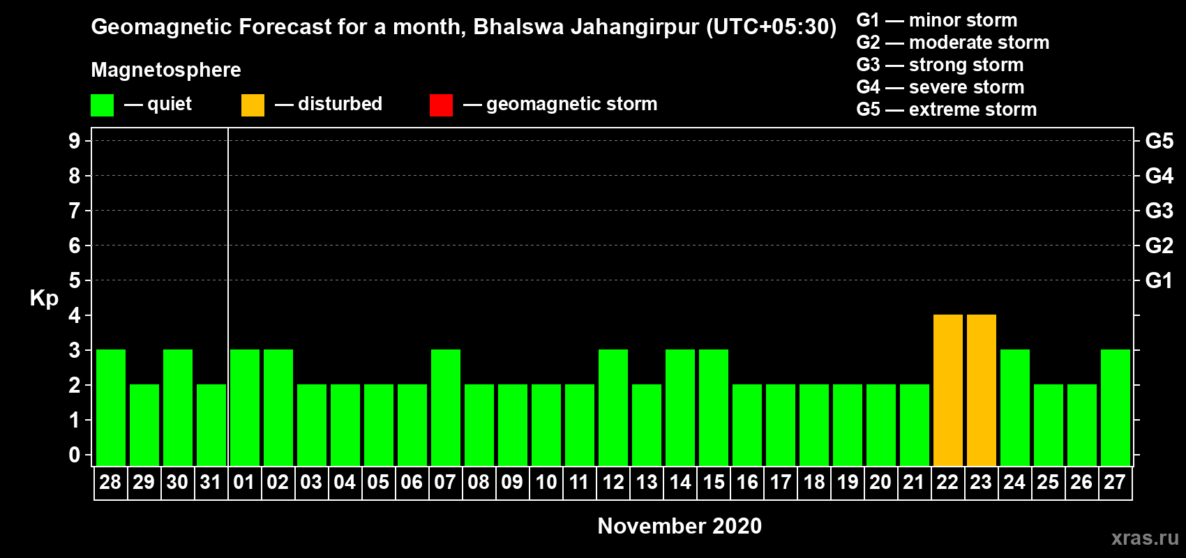 Geomagnetic activity forecast in Bhalswa Jahangirpur — Oct 28, 2020