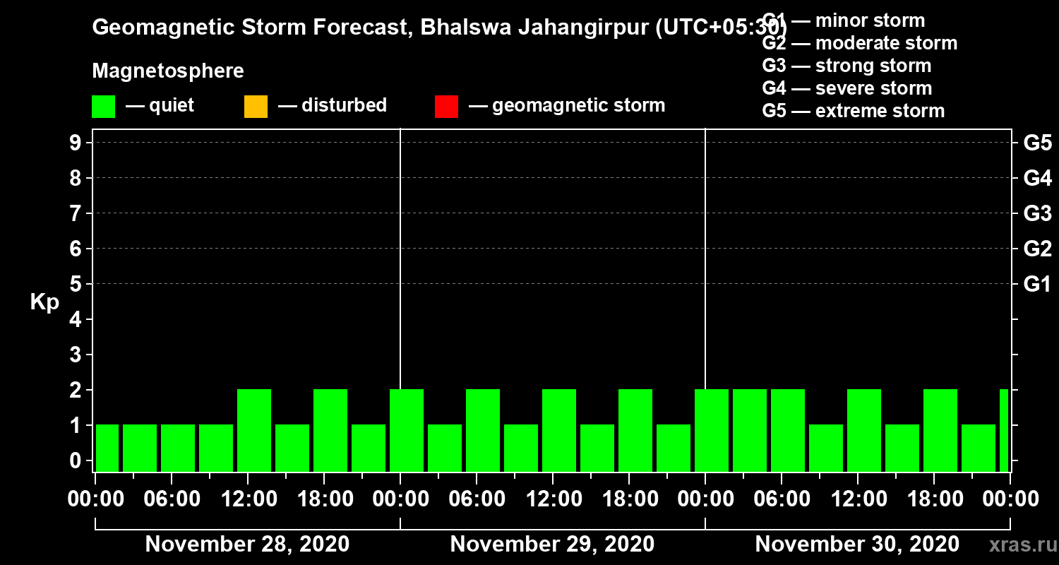 Geomagnetic storm forecast in Bhalswa Jahangirpur for Nov 28, 2020
