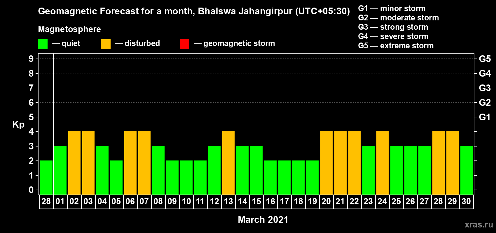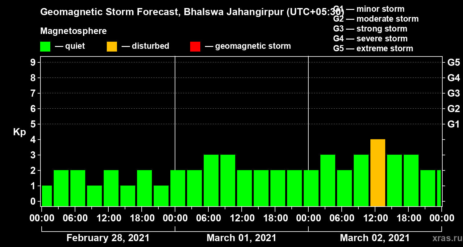 Geomagnetic storm forecast in Bhalswa Jahangirpur for Feb 28, 2021