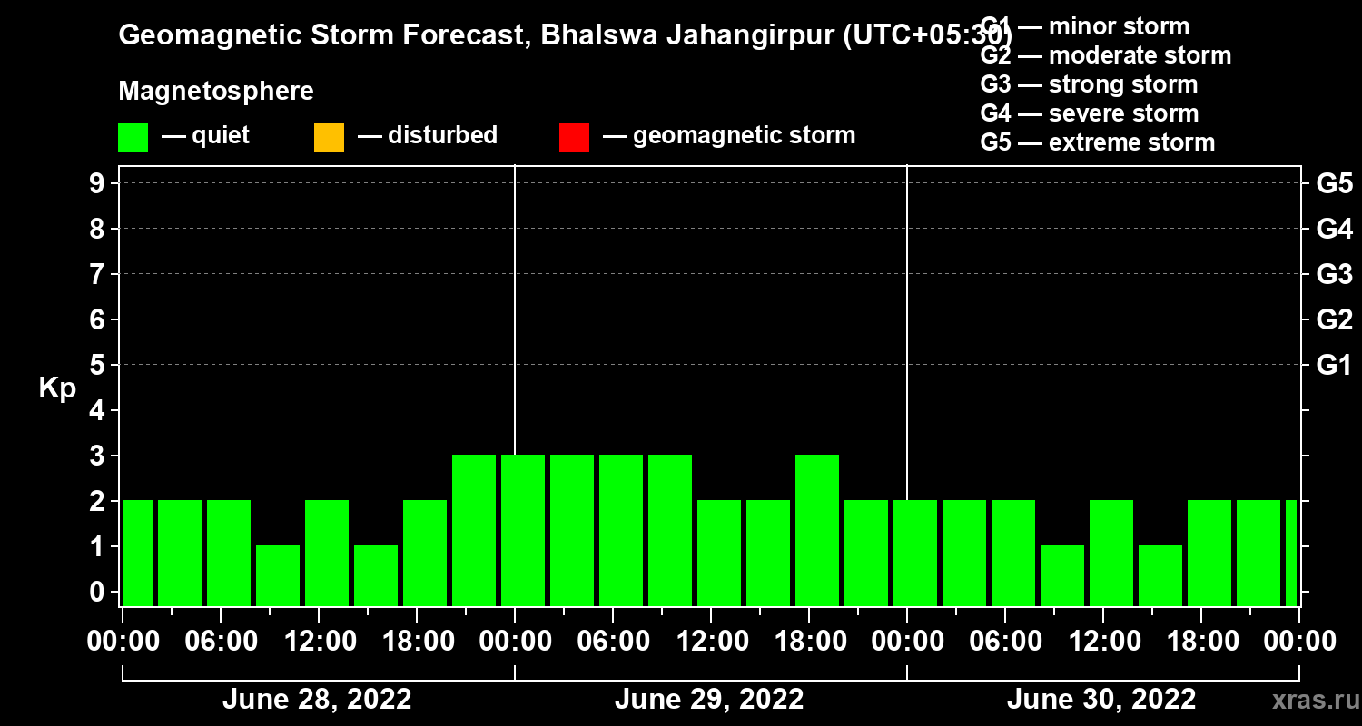 Geomagnetic storm forecast in Bhalswa Jahangirpur for Jun 28, 2022