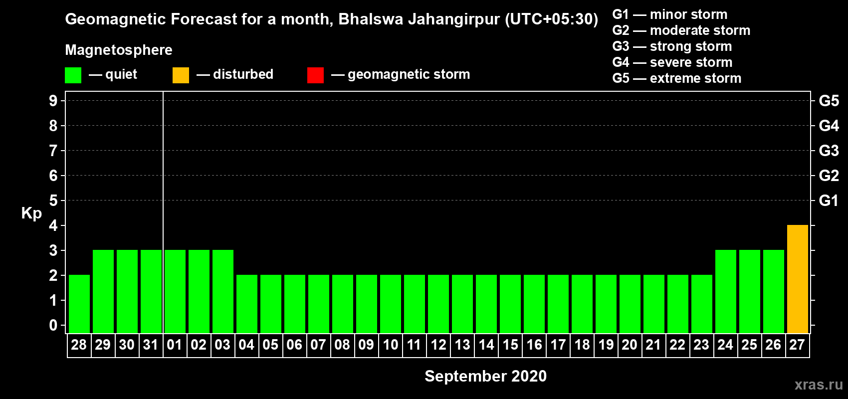 Geomagnetic storm forecast in Bhalswa Jahangirpur for Aug 28, 2020
