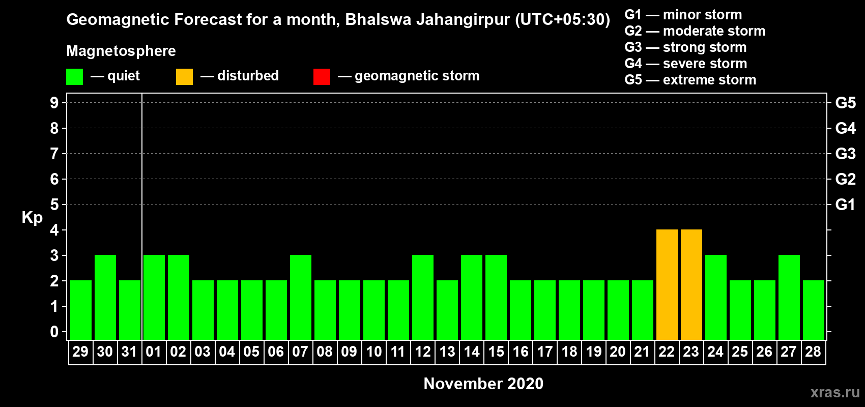 Geomagnetic storm forecast in Bhalswa Jahangirpur for Oct 29, 2020