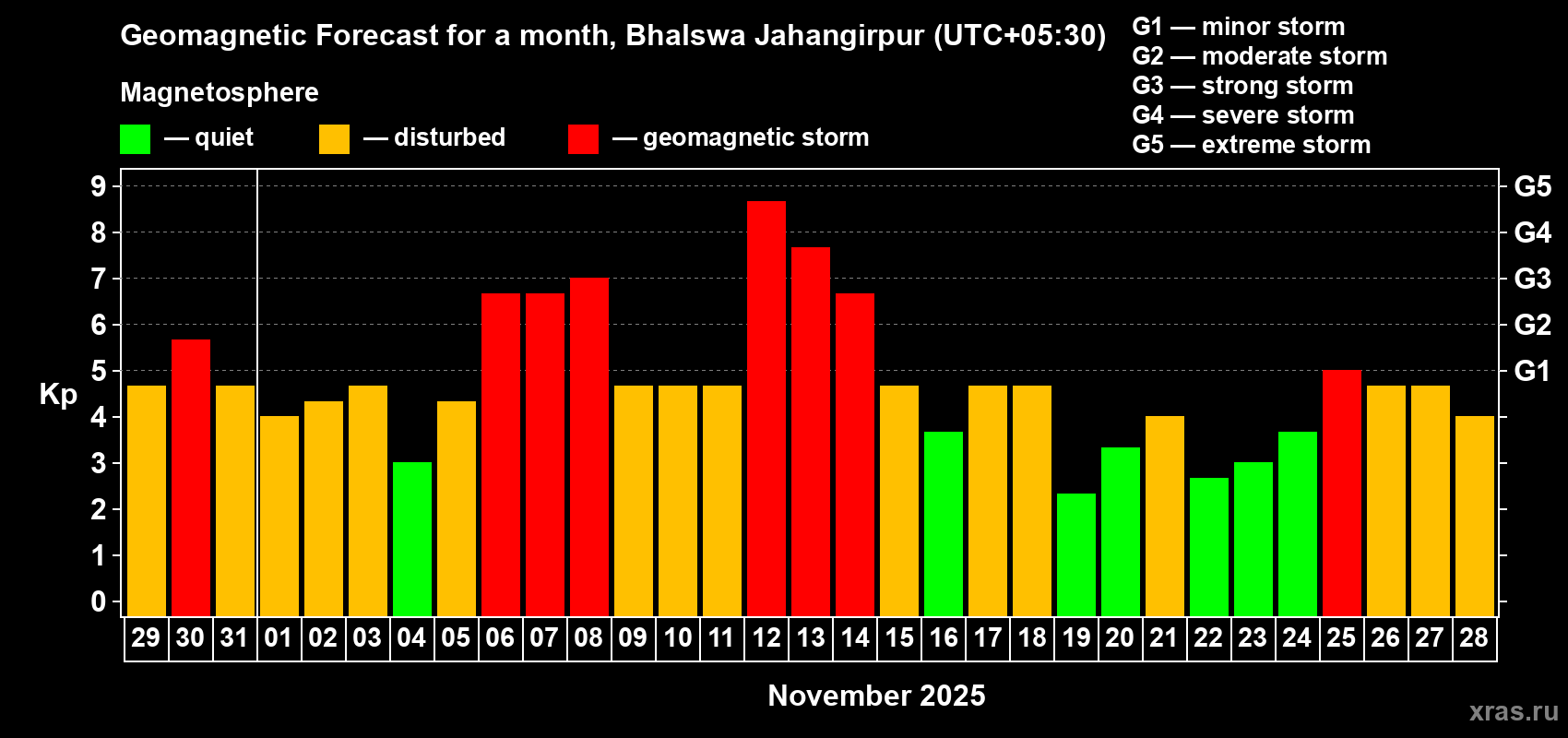 Geomagnetic storm forecast in Bhalswa Jahangirpur for Oct 29, 2025