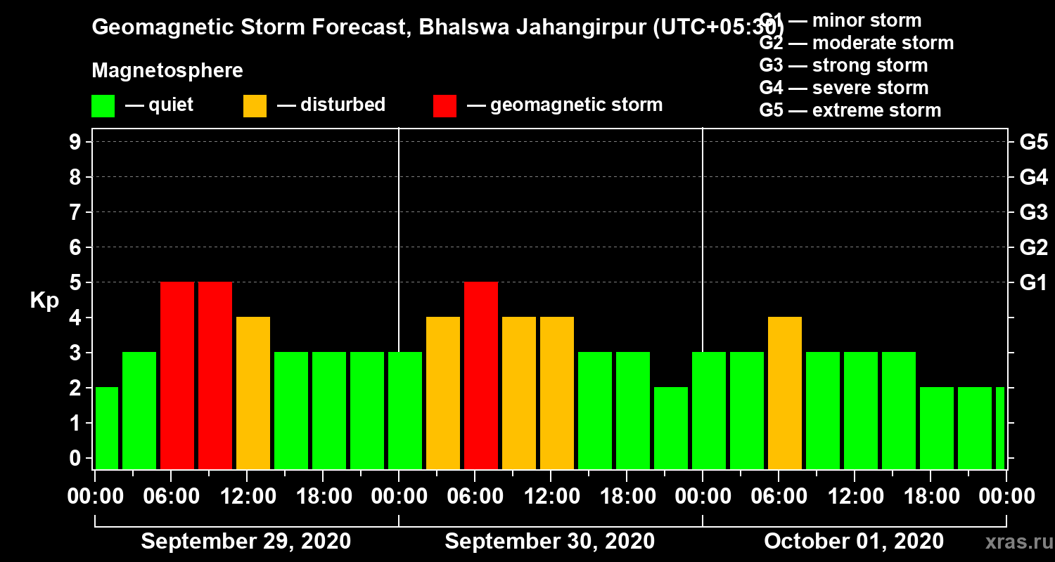 Geomagnetic storm forecast in Bhalswa Jahangirpur for Sep 29, 2020