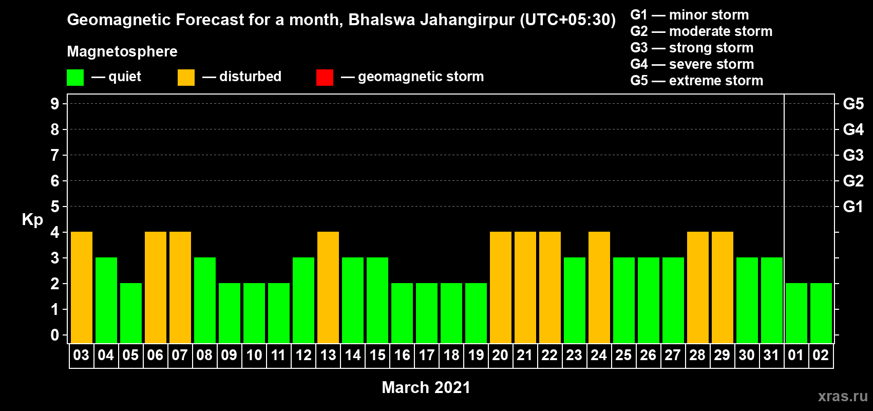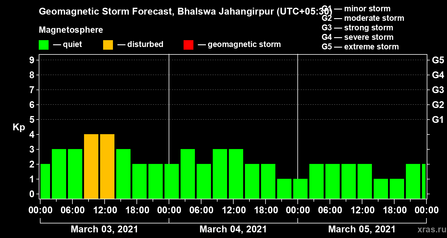 Geomagnetic storm forecast in Bhalswa Jahangirpur for Mar 03, 2021