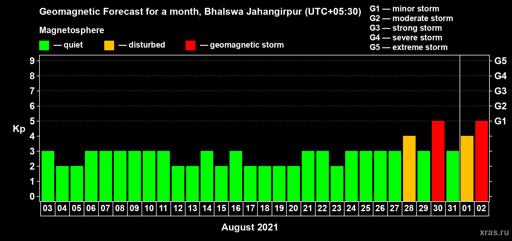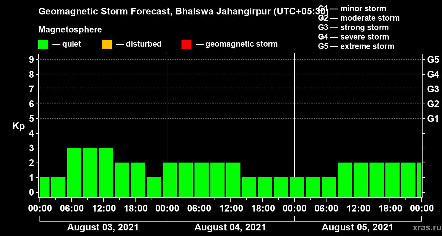 Geomagnetic storm forecast in Bhalswa Jahangirpur for Aug 03, 2021