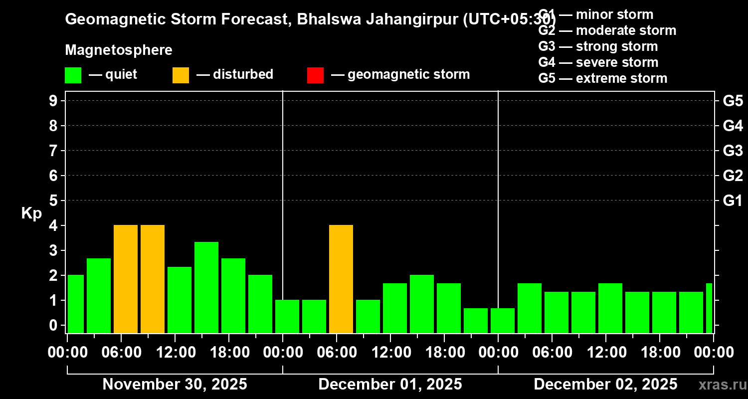 Geomagnetic storm forecast in Bhalswa Jahangirpur for Nov 30, 2025