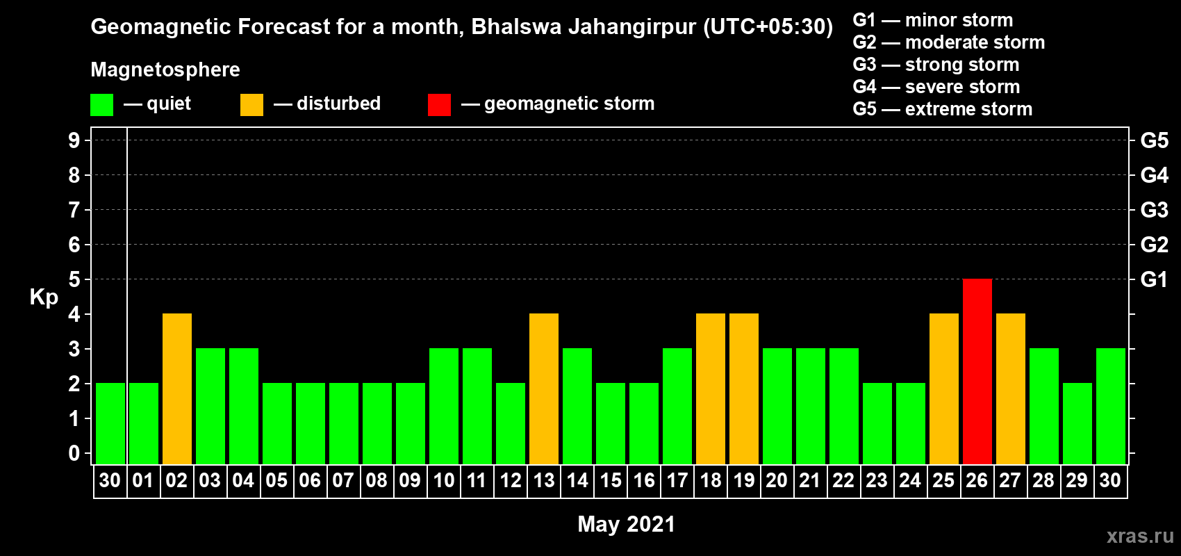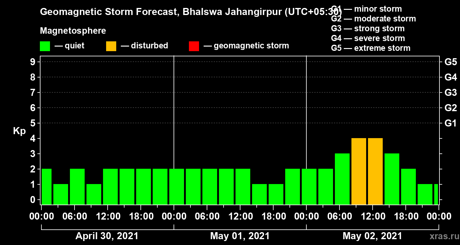 Geomagnetic storm forecast in Bhalswa Jahangirpur for Apr 30, 2021