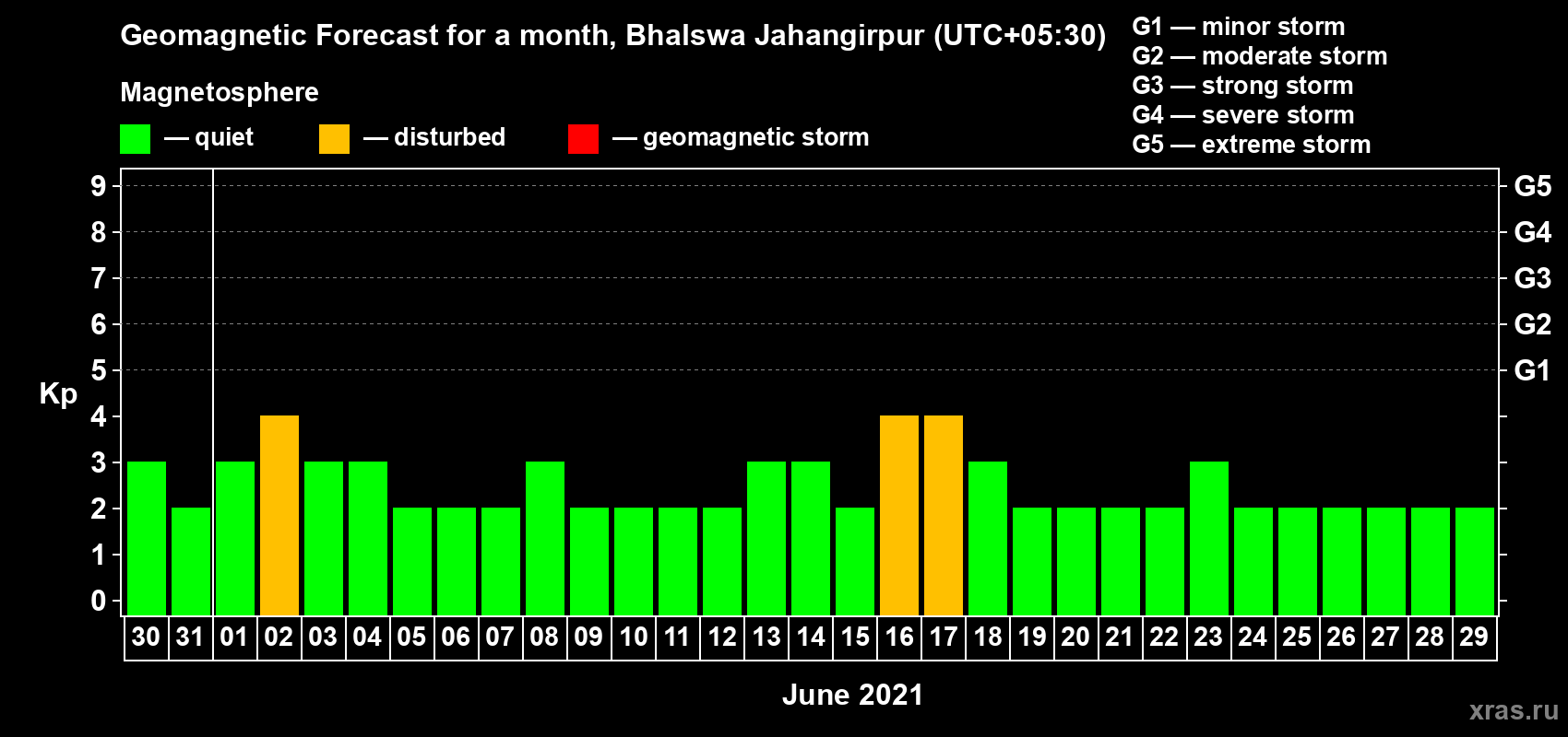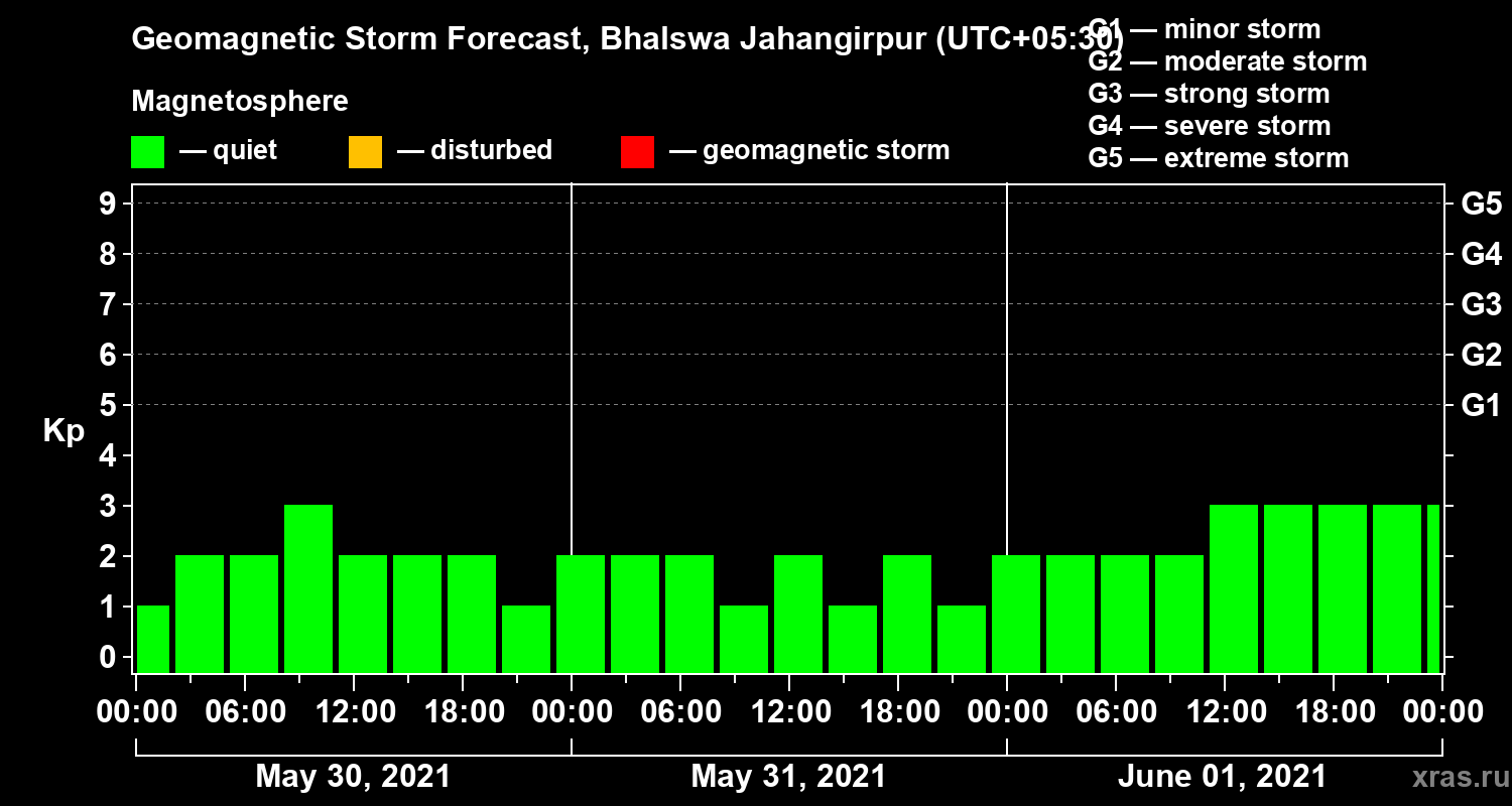 Geomagnetic storm forecast in Bhalswa Jahangirpur for May 30, 2021