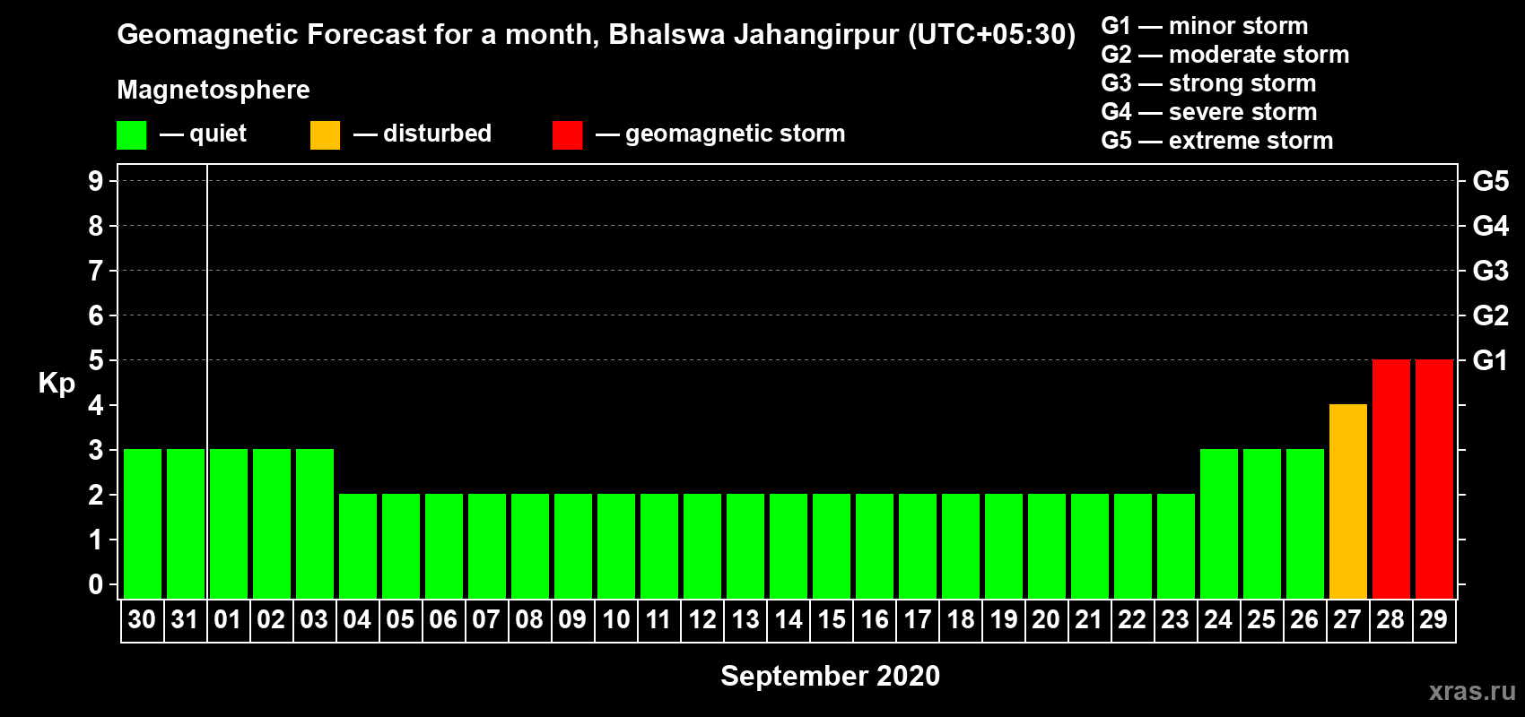 Geomagnetic storm forecast in Bhalswa Jahangirpur for Aug 30, 2020
