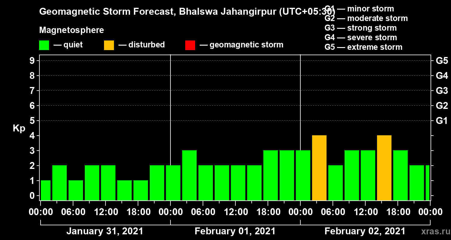 Geomagnetic storm forecast in Bhalswa Jahangirpur for Jan 31, 2021