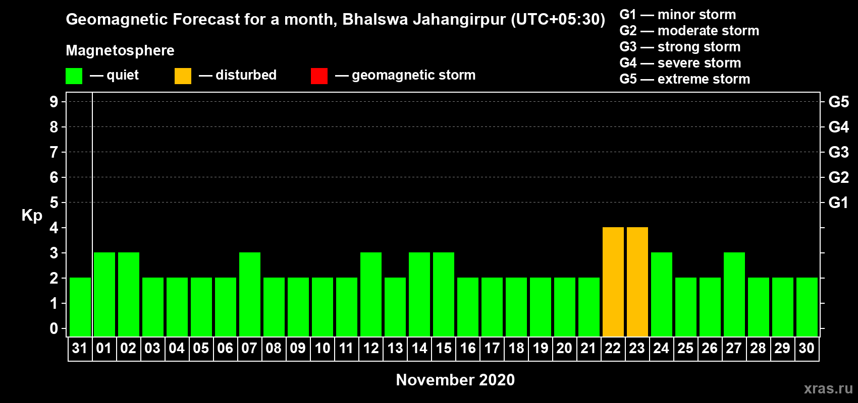 Geomagnetic storm forecast in Bhalswa Jahangirpur for Oct 31, 2020