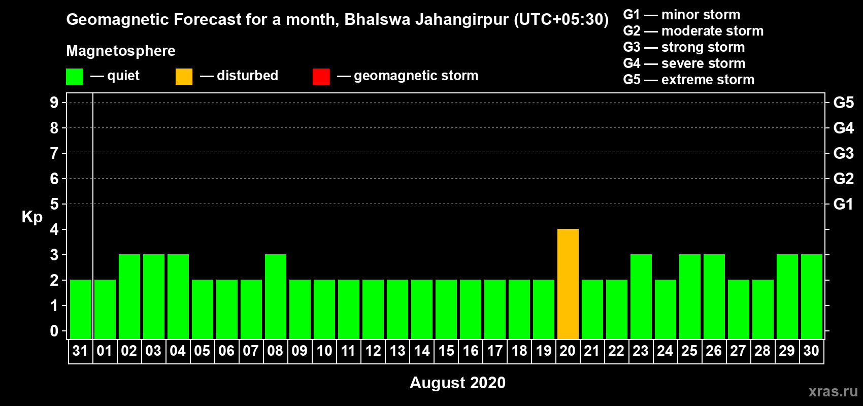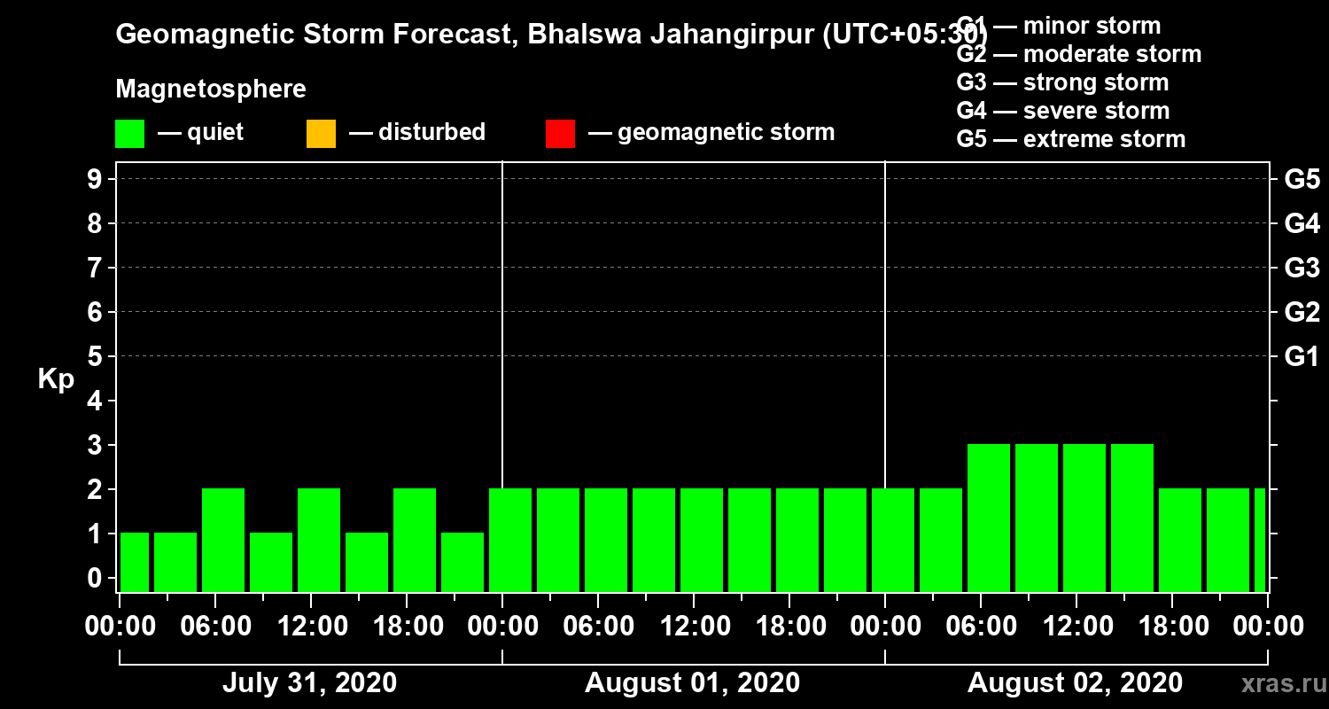 Geomagnetic storm forecast in Bhalswa Jahangirpur for Jul 31, 2020