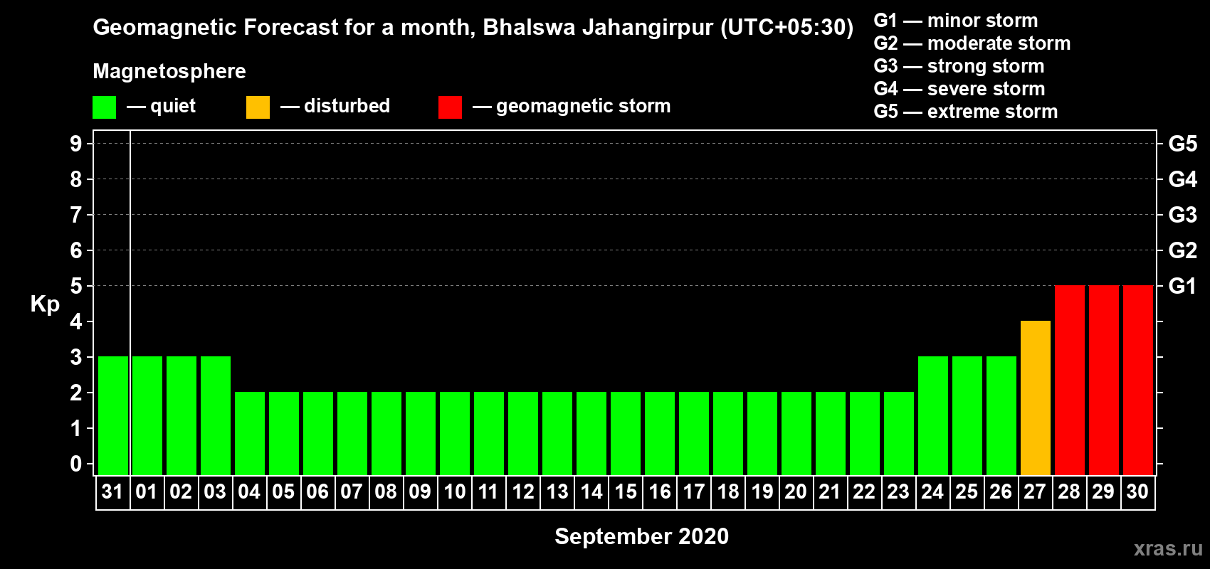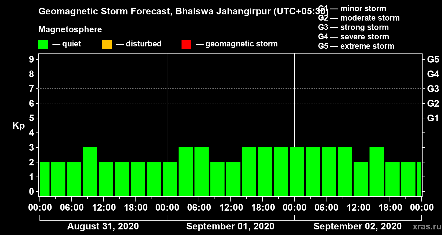 Geomagnetic storm forecast in Bhalswa Jahangirpur for Aug 31, 2020