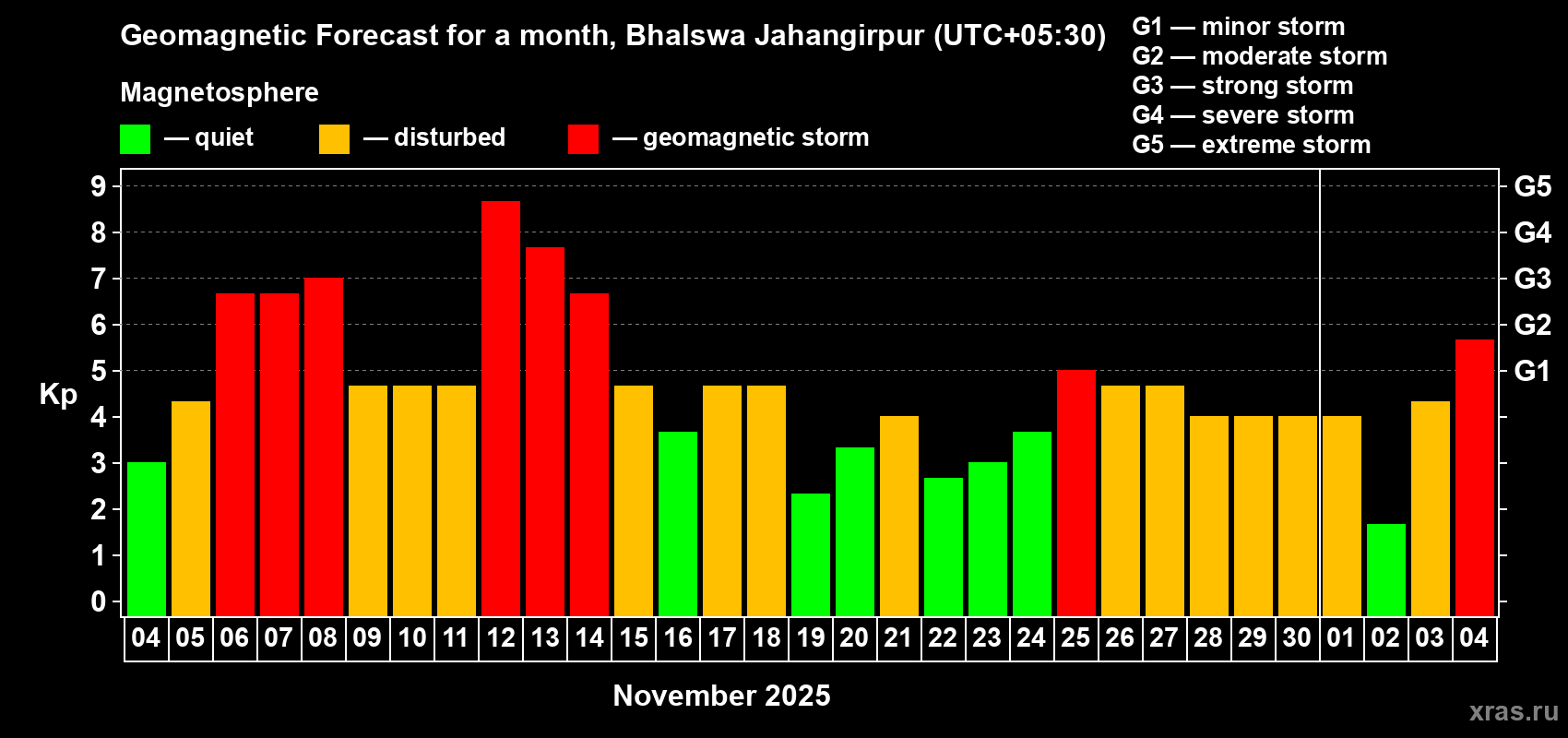Geomagnetic storm forecast in Bhalswa Jahangirpur for Nov 04, 2025