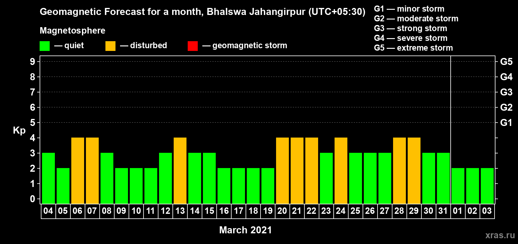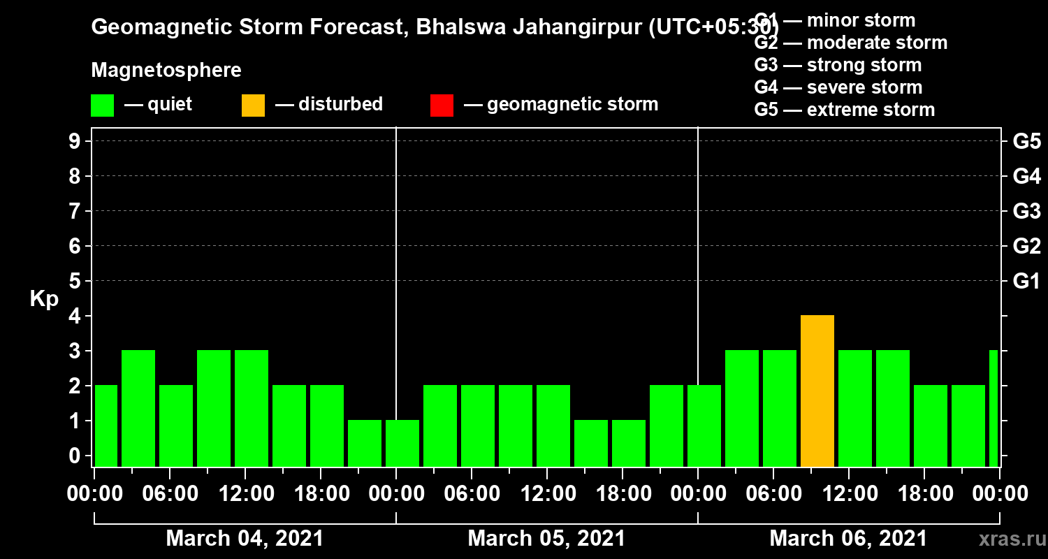 Geomagnetic storm forecast in Bhalswa Jahangirpur for Mar 04, 2021